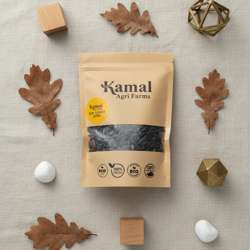 Fuel your day with the pure, nutty goodness of Kamal Agri Farms Sunflower Seeds. Harvested with care and packed in eco-friendly kraft packaging, our black sunflower seeds are the perfect nutrient-dense snack for health-conscious foodies. Whether you're tossing them over a fresh salad, blending them into a morning smoothie, or enjoying them straight from the bag, these seeds deliver a satisfying crunch and a wealth of health benefits.